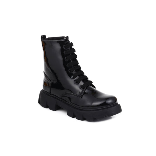 Buckle Strapped Chunky Cleated Lace-up Black Boots for Women