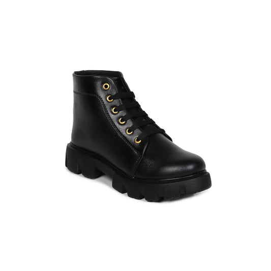 Buckle Strapped Chunky Cleated Lace-up Black Boots for Women